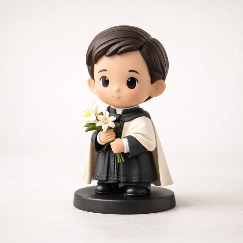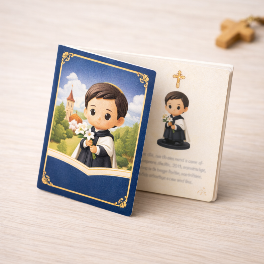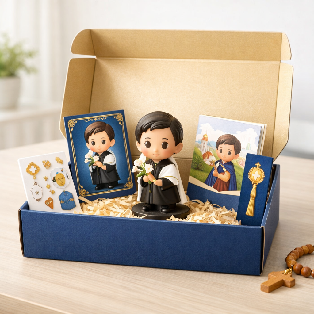 A primeira edição do Clube Pequenos Santos apresenta São Luiz Gonzaga, padroeiro da juventude e exemplo de pureza e fidelidade a Deus. As famílias que participarem da pré‑venda receberão este mini‑box especial que marca o início da coleção.