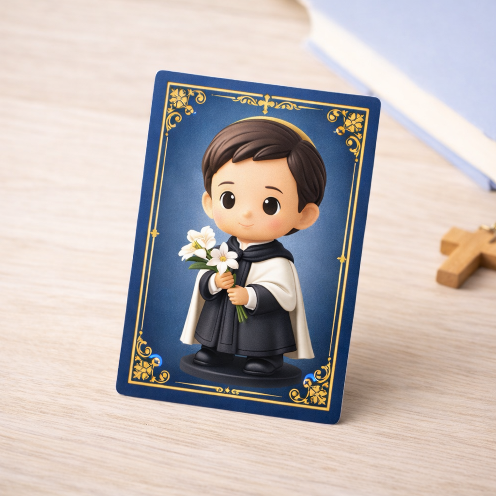 A primeira edição do Clube Pequenos Santos apresenta São Luiz Gonzaga, padroeiro da juventude e exemplo de pureza e fidelidade a Deus. As famílias que participarem da pré‑venda receberão este mini‑box especial que marca o início da coleção.
