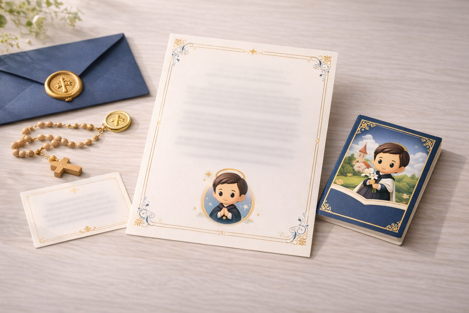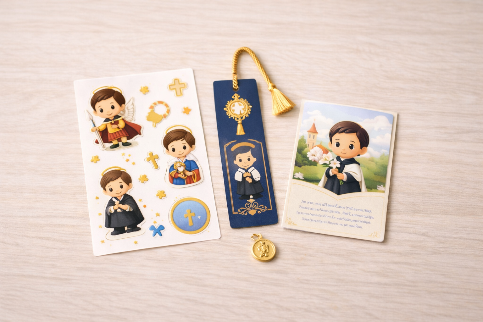 Pode ser adesivo, marcador de página, oração curta infantil ou outro mimo de baixo custo e alto valor percebido.